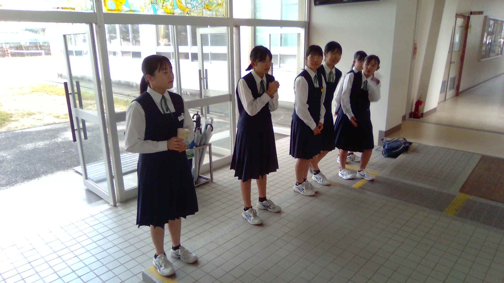 重信中学校では、登校時間帯に「緑の募金(緑の羽根募金)」を行っています。T-ボランリーダーを中心に、今朝も各学年の靴箱で募金の呼び掛けを行いました。